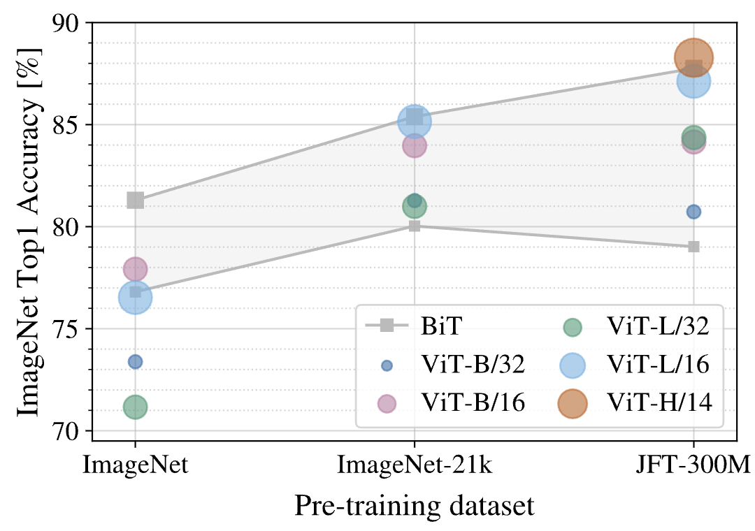 10M 정도로 pretraining size가 작을 때는 BiT가 더 성능이 좋은 것을 확인할 수 있습니다. ViT는 데이터셋의 크기가 너무 작아 일반적인 패턴을 감지하지 못하고 주어진 10M개의 데이터셋에 오버피팅된 것으로 추정됩니다. 그러나 pretraining 데이터셋 크기가 증가할 수록 점점 ViT의 성능이 좋아지는 것을 확인할 수 있습니다.
