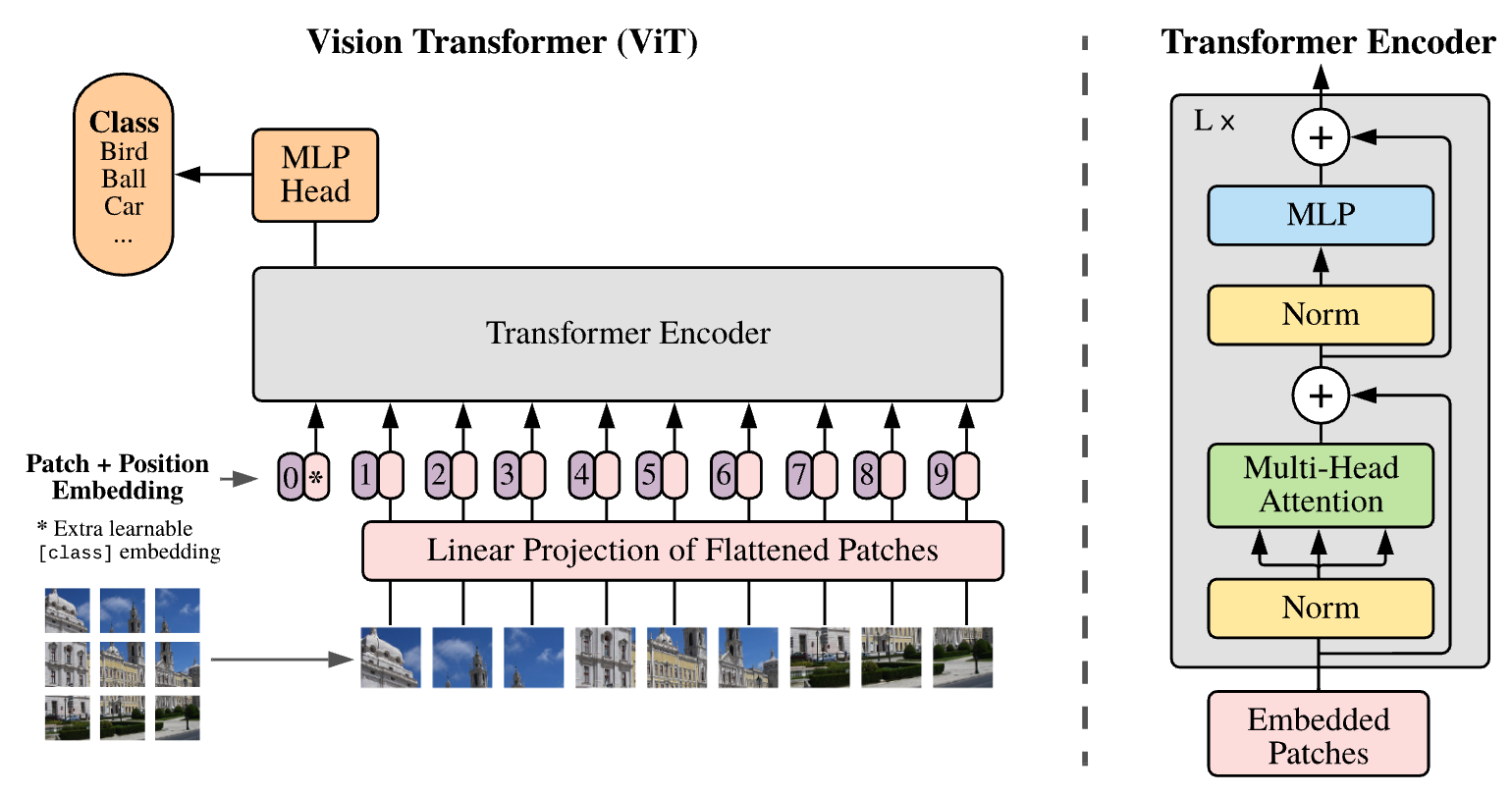 아래는 ViT의 전체적인 구조입니다. 저자는 Transformer가 NLP 도메인에서 보여줬던 장점을 최대한 유지하기 위해, Transformer의 기존 구조를 최대한 변경하지 않도록 하였습니다.