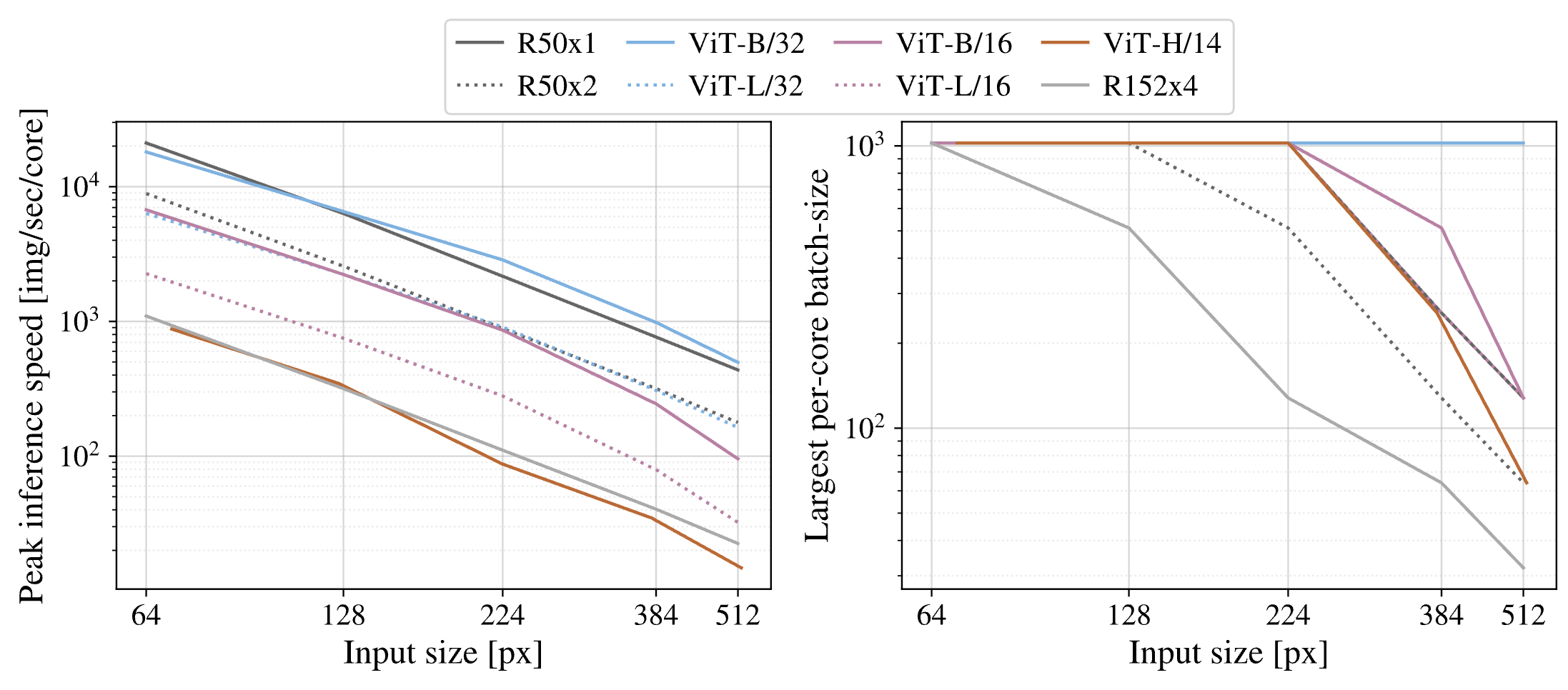왼쪽 그림은 다양한 input image size에 대해서 각각의 모델이 TPUv3 코어 하나에서 초당 처리할 수 있는 이미지가 몇개인지에 대해 나타낸 것입니다. 오른쪽 그림은 다양한 input image size에 대해서 각각의 모델이 코어 하나에서 최대로 가질 수 있는 batch size에 대해서 나타낸 것입니다.