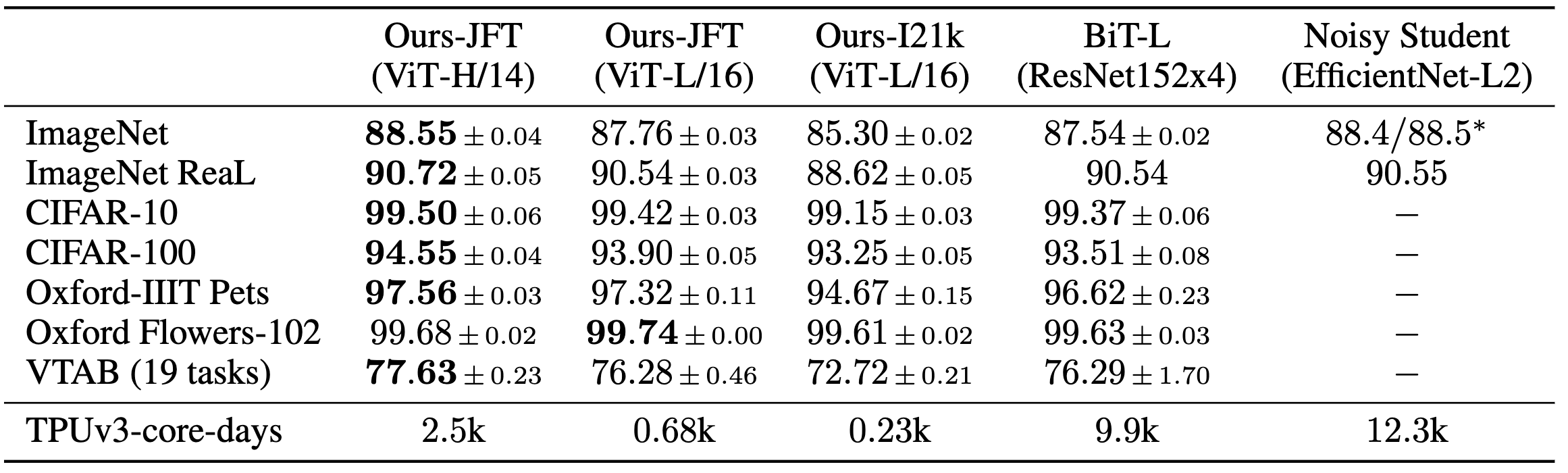 특히나 주목해야할 부분은 TPUv3-core-days 지표입니다. TPUv3-core-days는 해당 모델을 pretraining 하는데에 며칠이 걸리는지 나타낸 지표입니다. 예를 들어 제가 TPUv3 8 core로 pretraining을 진행한다면, ViT-L/16을 ImageNet-21k에서 pretraining 하는데에는 $\frac{0.23k}{8} \approx 29$ 일이 소요되는 것입니다. TPUv3가 A100 정도 GPU와 비슷한 성능이라고 하는데, 한 달도 정말 길지만 그래도 ViT가 BiT-L, Noisy Student 보다는 pretraining cost가 확실히 적은 것을 알 수 있습니다.