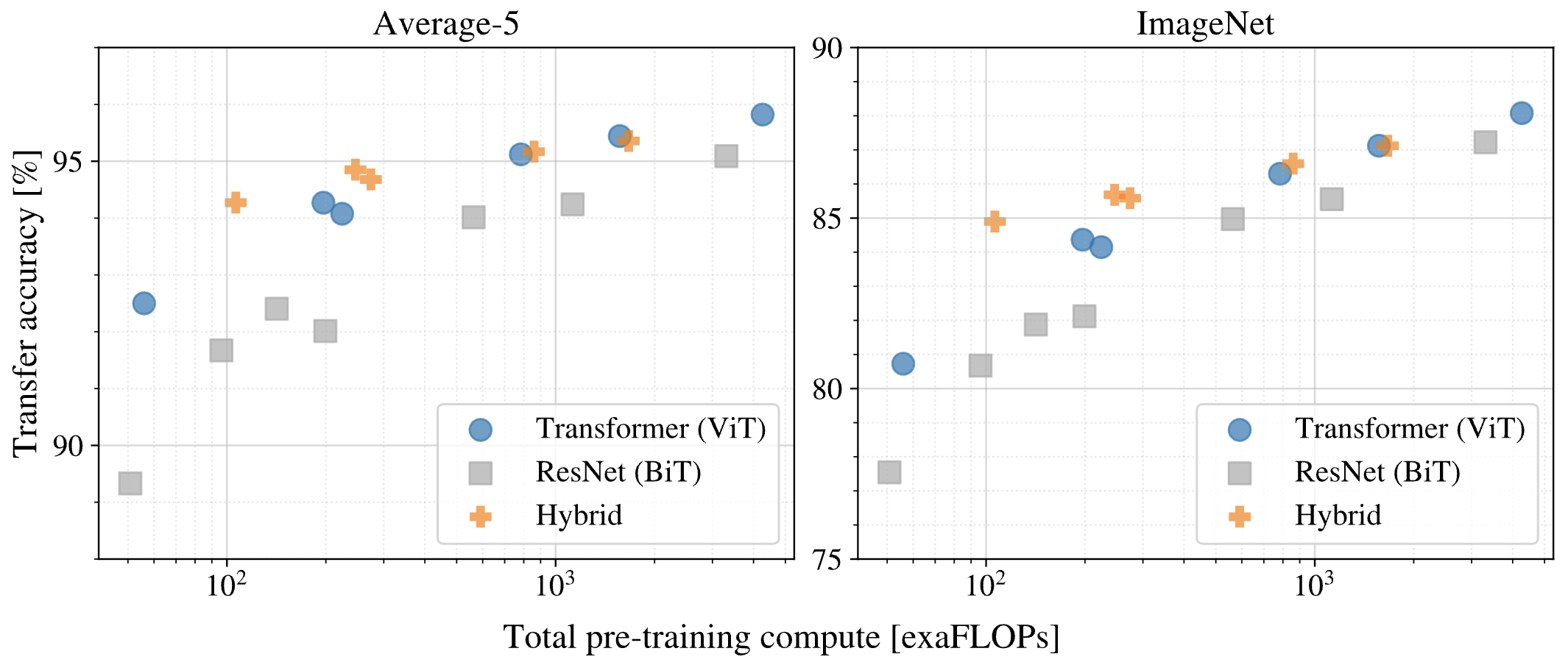 BiT, ViT에 대해서 pretraining cost에 대한 transfer accuracy를 측정했습니다. Pretraining은 JFT-300M에서 진행했다고 합니다. Average-5는 transfer accuracy를 측정한 5개 데이터셋에서의 평균, ImageNet은 ImageNet에서의 transfer accuracy를 나타낸 것입니다.